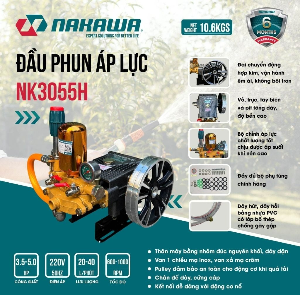 Đầu phun áp lực Nakawa NK3055H là sản phẩm mới của thương hiệu Nakawa được sản xuất theo công nghệ Nhật Bản. Máy có hiệu suất làm việc mạnh mẽ hơn và áp lực nước lớn hơn. Giúp bạn dễ dàng xử lý mọi vết bám bẩn trên xe hoặc tường, sân, vườn, v.v. Sản phẩm có nhiều ưu điểm và tính năng vượt trội, mang lại nhiều lợi ích và tiện lợi khi sử dụng.