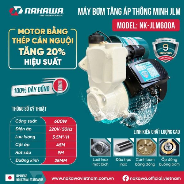 Máy bơm tăng áp thông minh NK-JLM600A là sản phẩm chất lượng cao theo tiêu chuẩn Nhật Bản, được sử dụng để hút nước và bơm lên các vị trí cao, hay dùng để tăng áp các thiết bị đầu ra như sen vòi, máy giặt, bình nóng lạnh, và các thiết bị khác… Máy bơm này không chỉ đảm bảo hiệu suất hoạt động mạnh mẽ mà còn được tích hợp các tính năng thông minh, giúp tăng độ an toàn và kéo dài tuổi thọ.